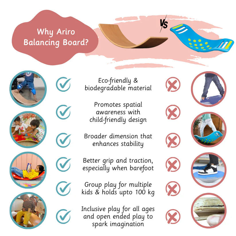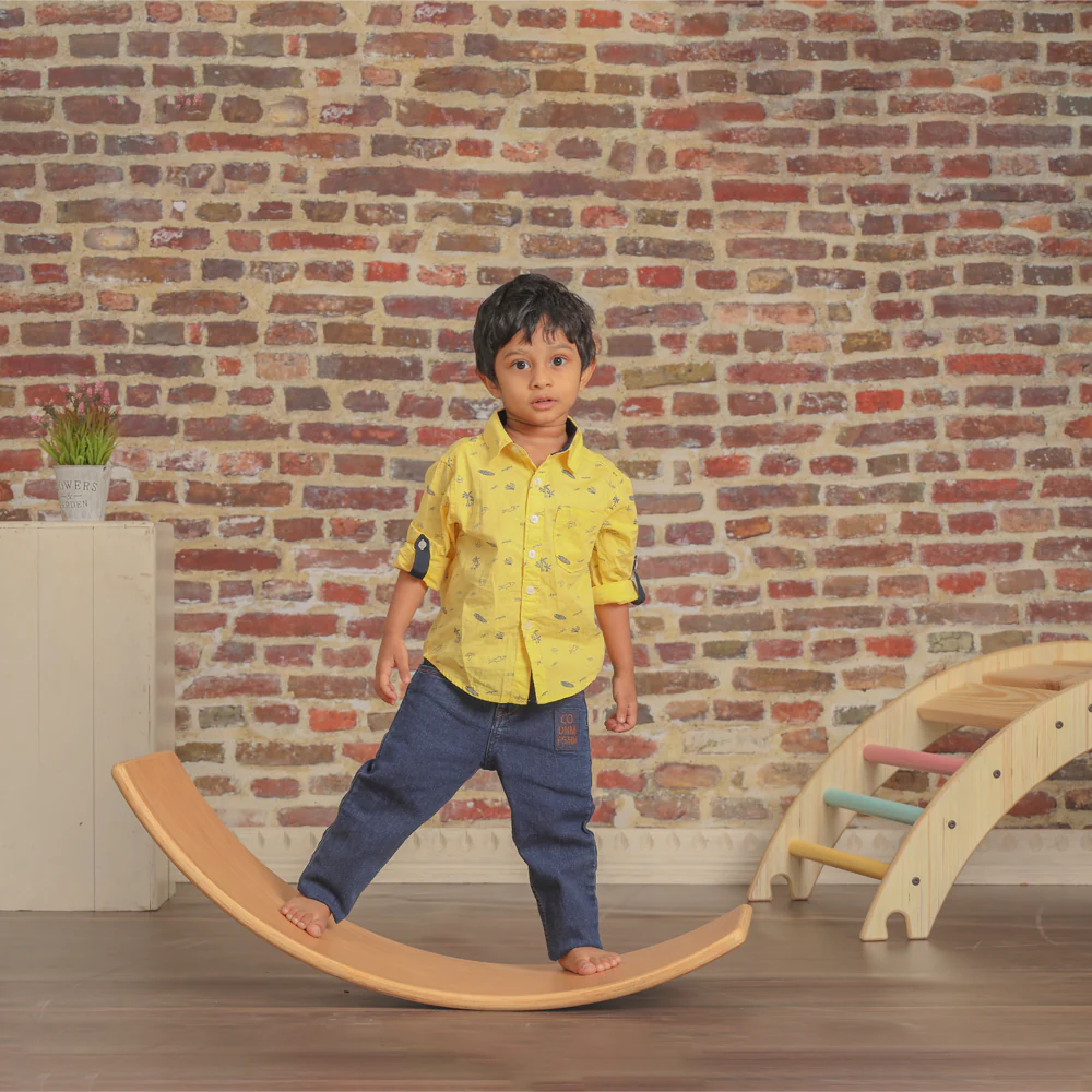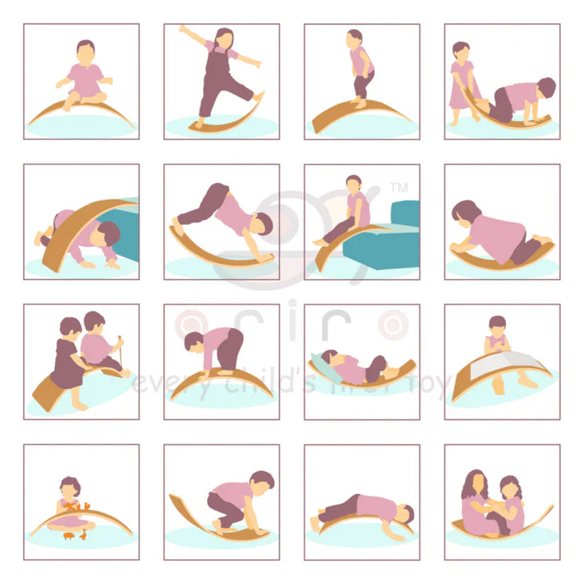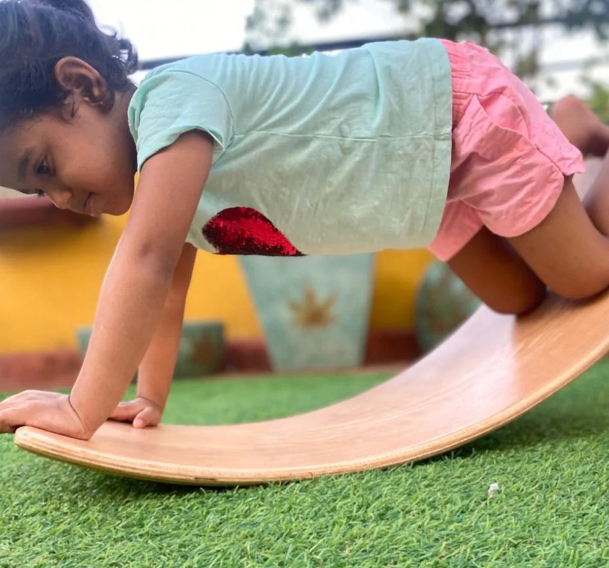 Balance board can be used to balance the body in a position which in turn helps exercise the muscles. Balance board can be used as a rocker when the child decides to sit and rock about.