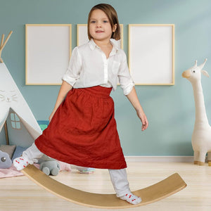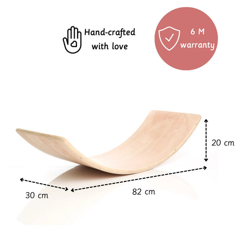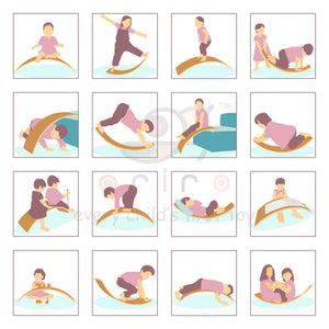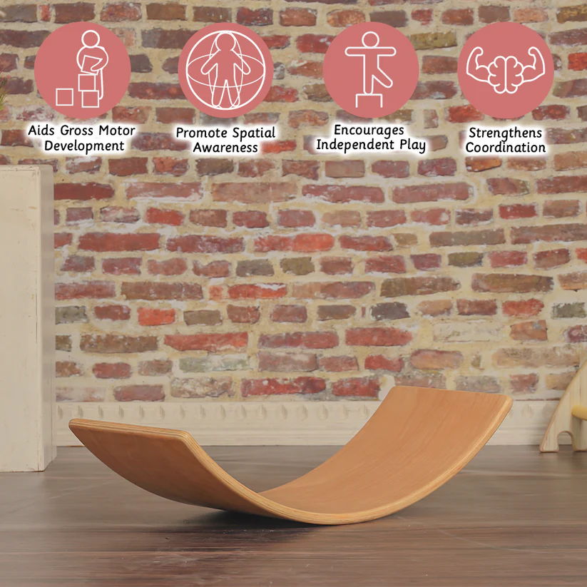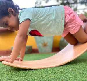 The Wobble Board, also known as the Balance board, the curvy board, or the wavy board is a versatile, open-ended gross motor toy. It is really a family toy and can be used indoors. It has numerous uses for physical and mental health development and limitless possibilities for open-ended play.
