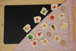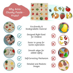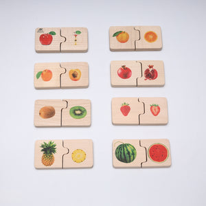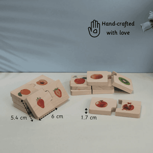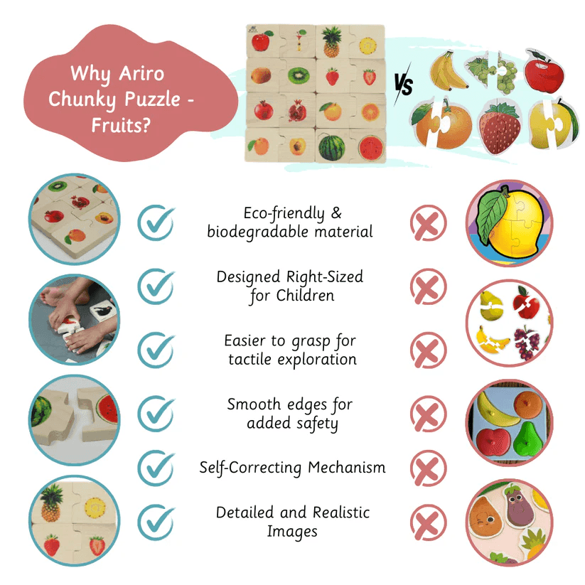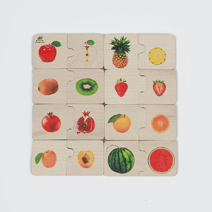 As adults, we can guide through the process of puzzle solving by instructing. Words used to instruct and describe the parts of the puzzle will enrich vocabulary. We can talk about the fruit names, and later on develop simple memory games.