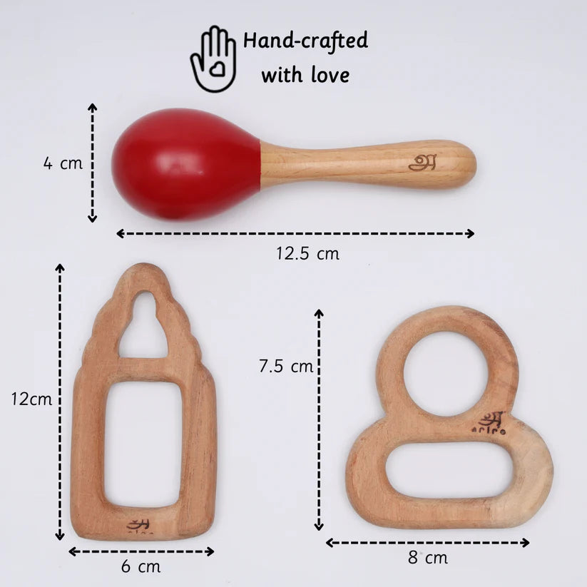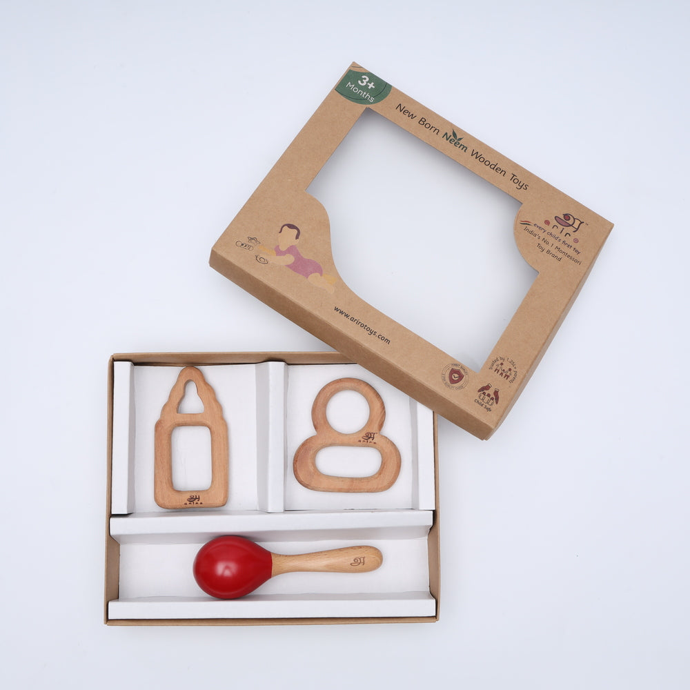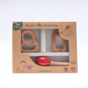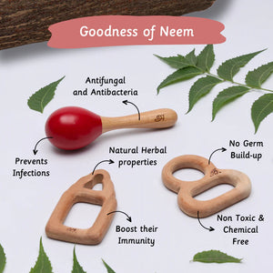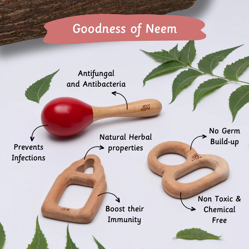 - We take delight in creating neem wood teethers, which are the first of their kind in the world. We source the best neem wood, which has been naturally aged for years to provide its medicinal benefit and is softly weighed for children to comfortably hold and put in their mouths. This includes a pair of teethers and a rattle, the perfect way to introduce a baby to wooden toys. Made of Neem wood, this gift box is ideal to be gifted for a loved one you are visiting.