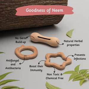 - These wooden teethers are made from Neem wood, that’s easy to grasp, is the best tool to suffice your baby’s teething needs and sooth those aching gums. This will be the perfect first toy for your baby. Neem wood is also Antibacterial and Antifungal, adding extra benefits to your child's play.