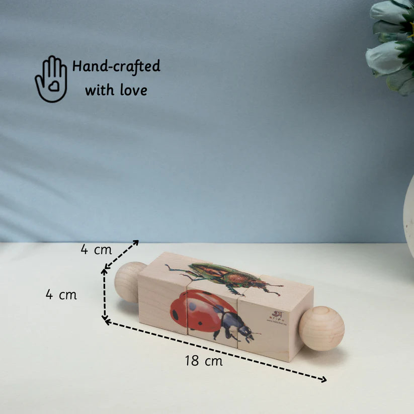 - Rotating Puzzle – Amphibians, Montessori puzzle is for kids of Age 18+ months. Its Dimension is 4 x 4 x 18 cm. The product is Made of Maple wood and is child safe.