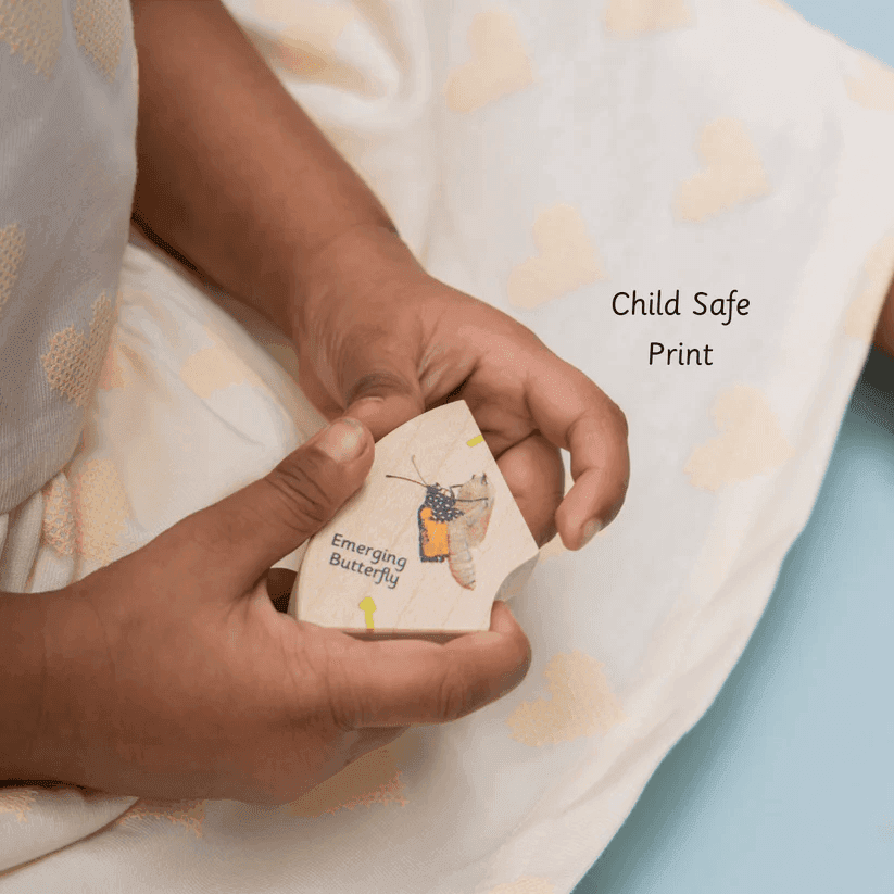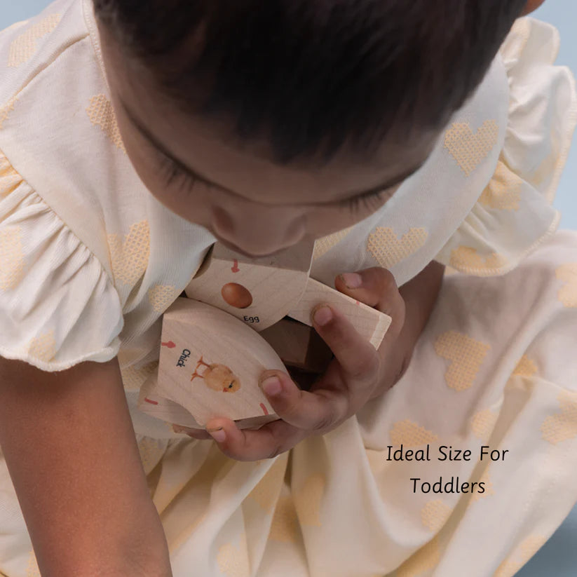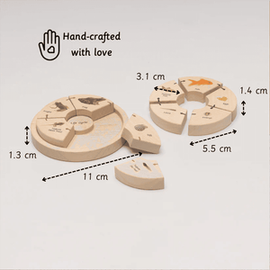 The entire set consists of 10 chunky puzzle pieces, to give a good sensorial experience. The pieces are printed on either side to add value to the product.