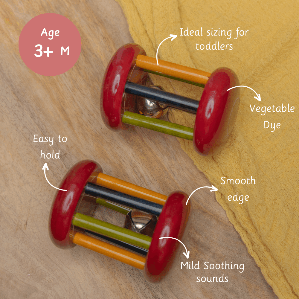 When you move the rattle over your baby they will tend to try and grasp. This ensures the Hand-eye coordination is addressed. Slowly Move the rattle across the child’s face and let them track the movement this process will help with Focus and Attention. This rattle shapes like a Cylinder will help your little one to completely hold and enjoy the solid while exploring it.