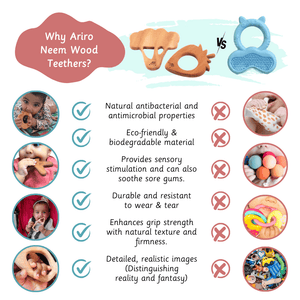Grasping wood helps the baby develop better motor skills and sensitivity. For your baby to hold and move the teether to their mouth is a task that helps develop hand-eye coordination. When your little one reaches out to the teether while on the back or tummy, It ensures Gross motor development. Ariro has combined the goodness of Neem with agile designing to bring about the finest teethers. It has all the goodness of Neem without its bitterness. Neem is antibacterial and antifungal, hence it requires less maintenance. Your baby’s every move is important and what they chew on matters a lot. Giving them synthetic substances is harmful to their immune system.