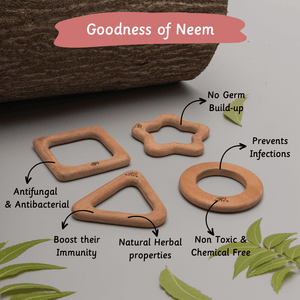 Grasping wood helps the baby develop better motor skills and sensitivity. For your baby to hold and move the teether to their mouth is a task that helps develop hand-eye coordination. When your little one reaches out to the teether while on the back or tummy, It ensures Gross motor development. Ariro has combined the goodness of Neem with agile designing to bring about the finest teethers. It has all the goodness of Neem without its bitterness. Neem is antibacterial and antifungal, hence it requires less maintenance. Your baby’s every move is important and what they chew on matters a lot. Giving them synthetic substances is harmful to their immune system.